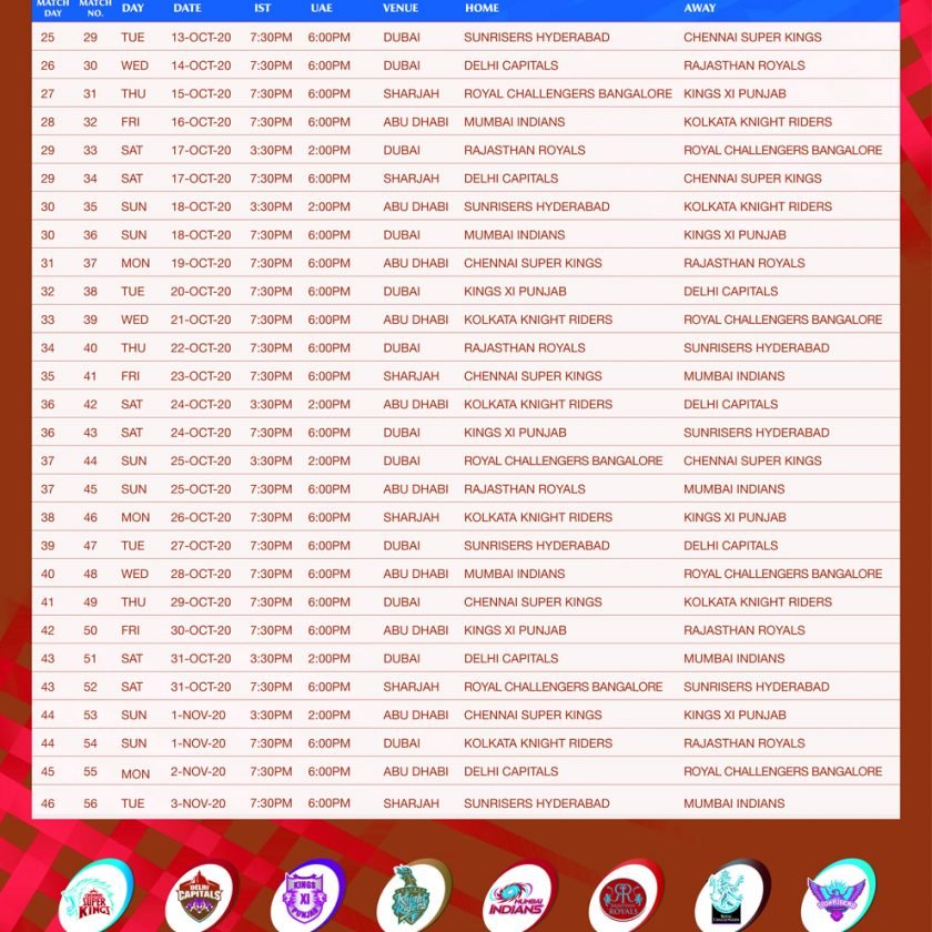 সূচি অনুযায়ী, প্রথম তথা উদ্বোধনী ম্যাচ হবে ১৯ তারিখ সন্ধ্যা সাড়ে ৭টায়। ম্যাচটি খেলা হবে মুম্বই ইন্ডিয়ান্স ও চেন্নাই সুপার কিংসের মধ্যে। খেলাটি হবে সংযুক্ত আরব আমিরশাহিতে। আইপিএল ম্যাচের রীতি মেনেই চ্যাম্পিয়ন ও রানার্স দলই প্রথম খেলায় মুখোমুখি হবে। অন্যদিকে, ২৩ সেপ্টেম্বরের সন্ধ্যা সাড়ে ৭টায় কলকাতা নাইট রাইডার্স মুখোমুখি হবে মুম্বই ইন্ডিয়ান্সের। ফাইনাল হবে ১০ নভেম্বর। এবারের আইপিএলে মোট ৫৬টি ম্যাচের পাশাপাশি ২১টি করে ম্যাচ হবে দুবাই ও আবুধাবিতে। অন্যদিকে শারজায় থাকছে ১৪টি।