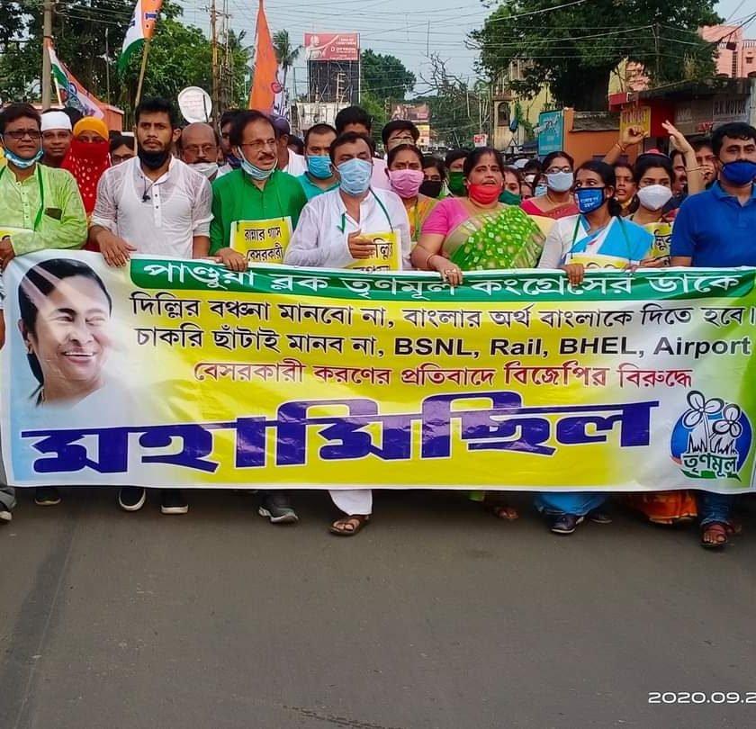 মঙ্গলবার বিকেলে হুগলি জেলা তৃণমূল কংগ্রেসের সভাপতি দিলীপ যাদবের নেতৃত্বে ও পান্ডুয়া ব্লক তৃণমূল কংগ্রেসের সভাপতি অসিত চ্যাটার্জির উদ্যোগে লাভজনক কেন্দ্রীয় সংস্থার বিলগ্নীকরণ ও রাজ্যের প্রতি কেন্দ্রীয় বঞ্চনার বিরোধিতায় এক মহা মিছিল আয়োজিত হল।